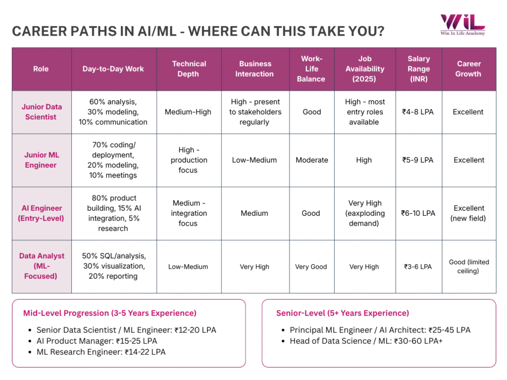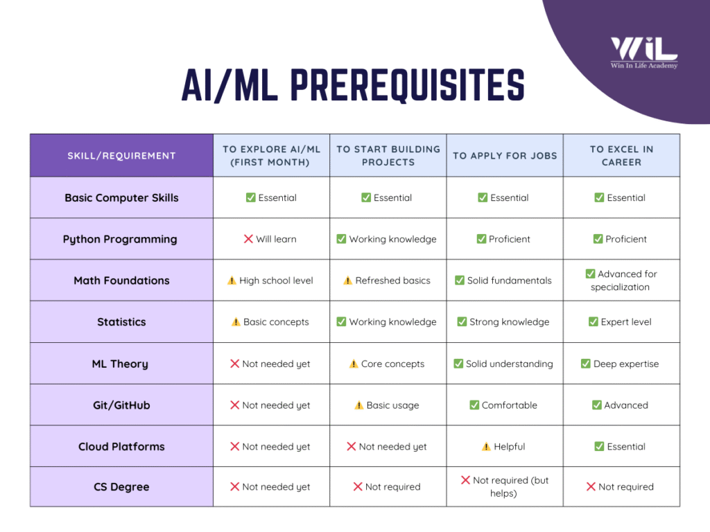 Ready to start your AI/ML journey? Win In Life Academy’s Advanced Diploma in AI ML Program is designed specifically for complete beginners, offering a structured curriculum that covers both modern AI and machine learning fundamentals. With hands-on projects, mentorship from industry professionals, and complete career support, you’ll build a strong portfolio and be well on your way to landing an AI/ML role within a year. Enroll today and take the first step toward your future career!