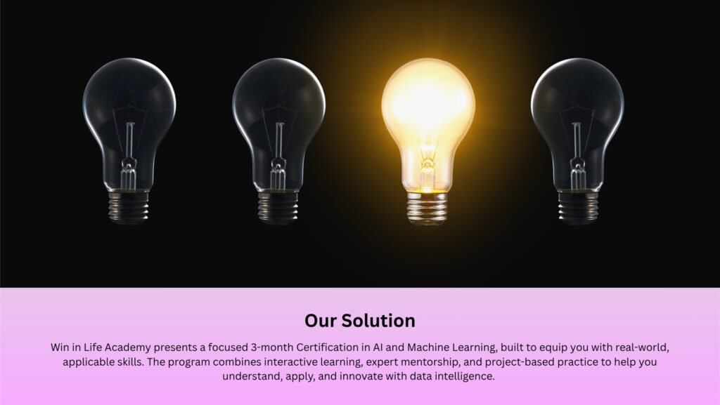 The AI certificate course offered by Win in Life Academy provides a structured introduction to Artificial Intelligence concepts, tools, and applications. Over three months, learners gain a solid foundation in Python, data analytics, and machine learning fundamentals through hands-on exercises and guided projects. .