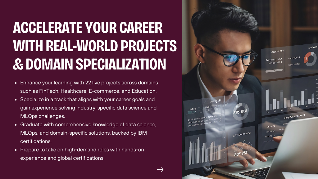 You will complete 22 live industry projects, IBM-guided labs, and practical exercises in model deployment and monitoring. Each project simulates real workflows in data engineering, cloud automation, and MLOps pipelines, preparing you for production environments.
