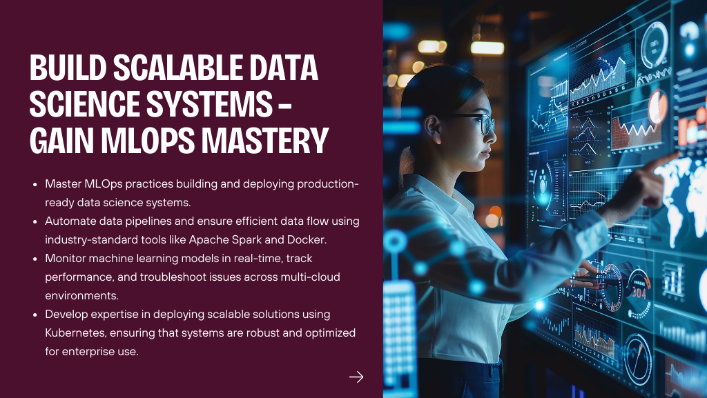 While many programs teach only ML algorithms, this course uniquely integrates end-to-end MLOps training, focusing on deployment, automation, monitoring, and governance. You learn not only how to build models but also how to push them into production, aligning with the industry’s shift toward data science and MLOps combined roles.