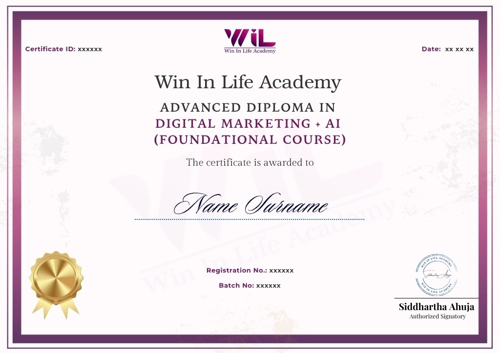 Once you complete an advanced diploma in digital marketing and AI for performance specialist, you will get globally recognized certification from Win in Life Academy.