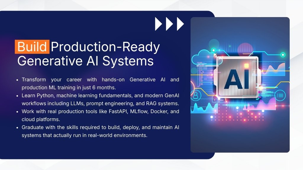 The Generative AI bootcamp is an intensive 6-month, 240-hour program designed to train learners in building, deploying, and maintaining production-grade Generative AI and machine learning systems. The curriculum covers Python, statistics, data handling, classical machine learning, deep learning, large language models (LLMs), prompt engineering, RAG systems, MLOps, Docker, and cloud deployment across AWS, GCP, and Azure. Learners work extensively with tools such as FastAPIMLflow, FAISS, ChromaDB, SHAP, LIME, and enterprise-aligned IBM GenAI labs focused on responsible and ethical AI. Through 16+ hands-on projects, production deployments, and an end-to-end capstone, the program prepares graduates for real-world roles including GenAI Engineer, Machine Learning Engineer, MLOps Engineer, AI Application Developer, and Production-focused Data Scientist.