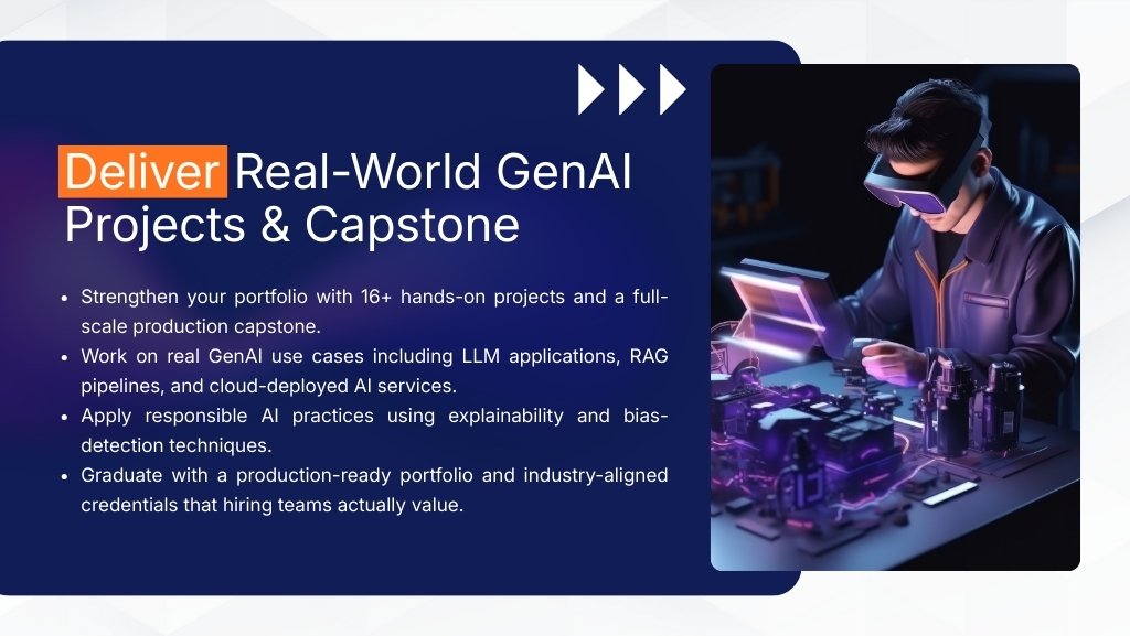 Strengthen your profile with 16+ hands-on projects and a production-grade capstone. Work on real GenAI use cases, API-based AI services, and cloud-deployed pipelines that demonstrate practical, job-ready skills.