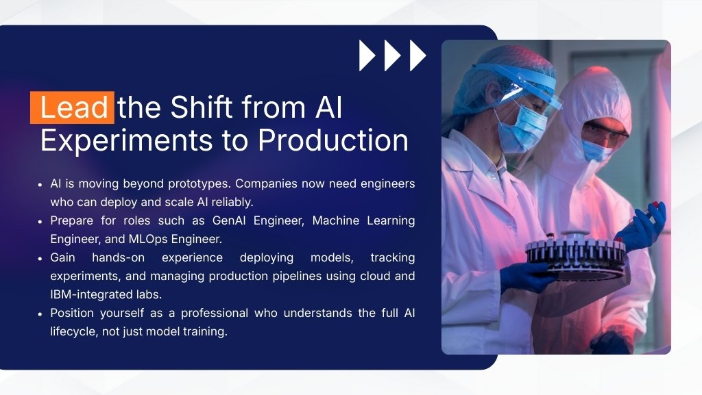 Prepare for in-demand roles such as GenAI Engineer, Machine Learning Engineer, MLOps Engineer, and AI Application Developer. Benefit from structured mentorship, industry-aligned projects, and portfolio-driven career preparation focused on real-world hiring expectations.