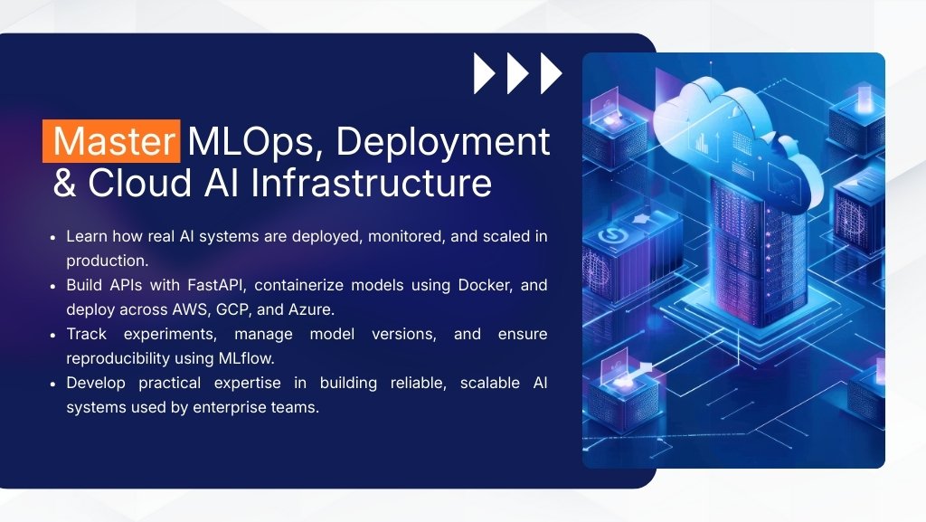 Gain hands-on experience with MLOps practices, including experiment tracking, model versioning, containerization, and cloud deployment. Build and deploy AI services using FastAPI, Docker, MLflow, and multi-cloud platforms such as AWS, GCP, and Azure.